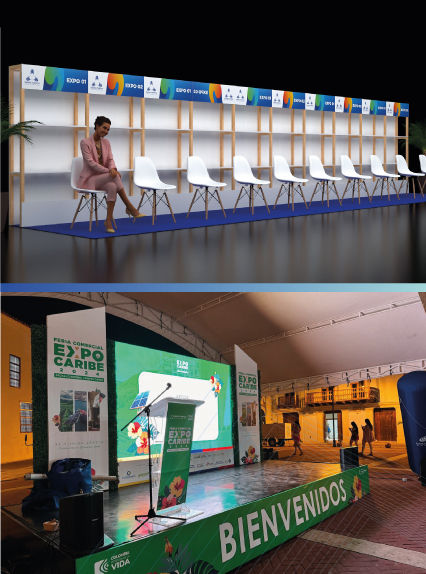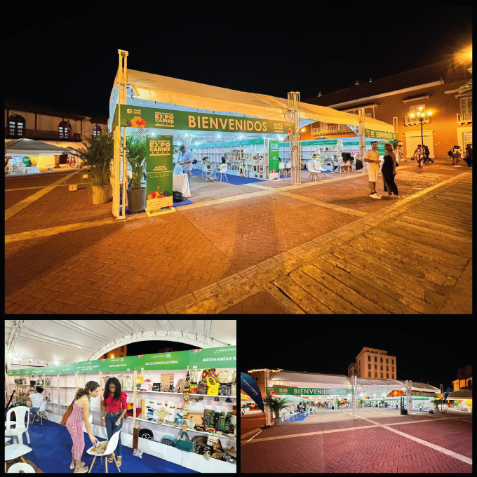El servicio de diseño, producción y montaje para EXPOCARIBE 2024, ejecutado para la Cámara de Comercio de Cartagena, incluyó la creación y montaje de más de 70 stands tipo feria, suministro de carpas, iluminación, escenografía y acometida eléctrica. Con una planificación detallada y una ejecución impecable, se garantizó un evento de gran envergadura y calidad, fortaleciendo la presencia de la Cámara de Comercio de Cartagena como un referente clave en el sector de los eventos.