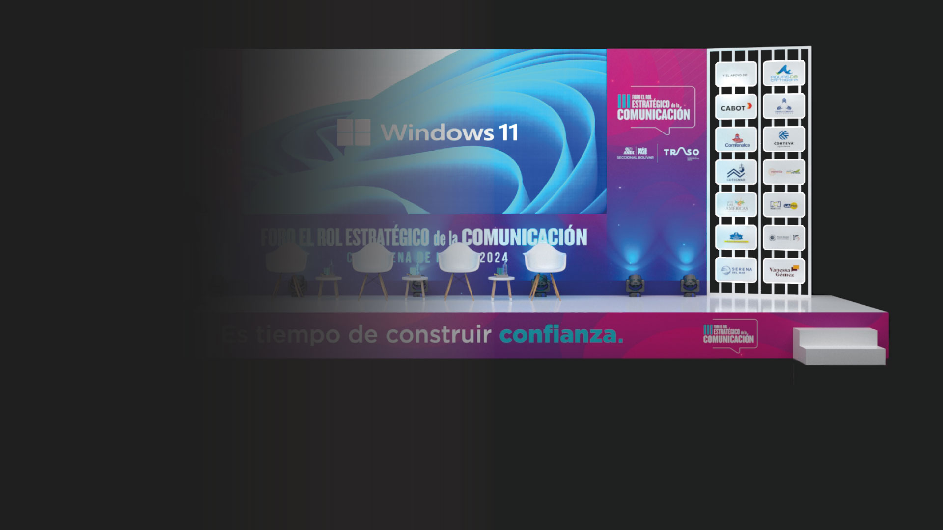 El servicio de diseño, producción y montaje para el Foro de Comunicaciones 2024, ejecutado para el cliente Colectivo Trasó, incluyó el diseño y montaje de una escenografía impactante y un sistema de iluminación de alta calidad. Con una propuesta visual moderna y profesional, el evento se desarrolló con una atmósfera única que reflejó la relevancia de Colectivo Trasó en el sector de los eventos, asegurando una experiencia memorable para los asistentes